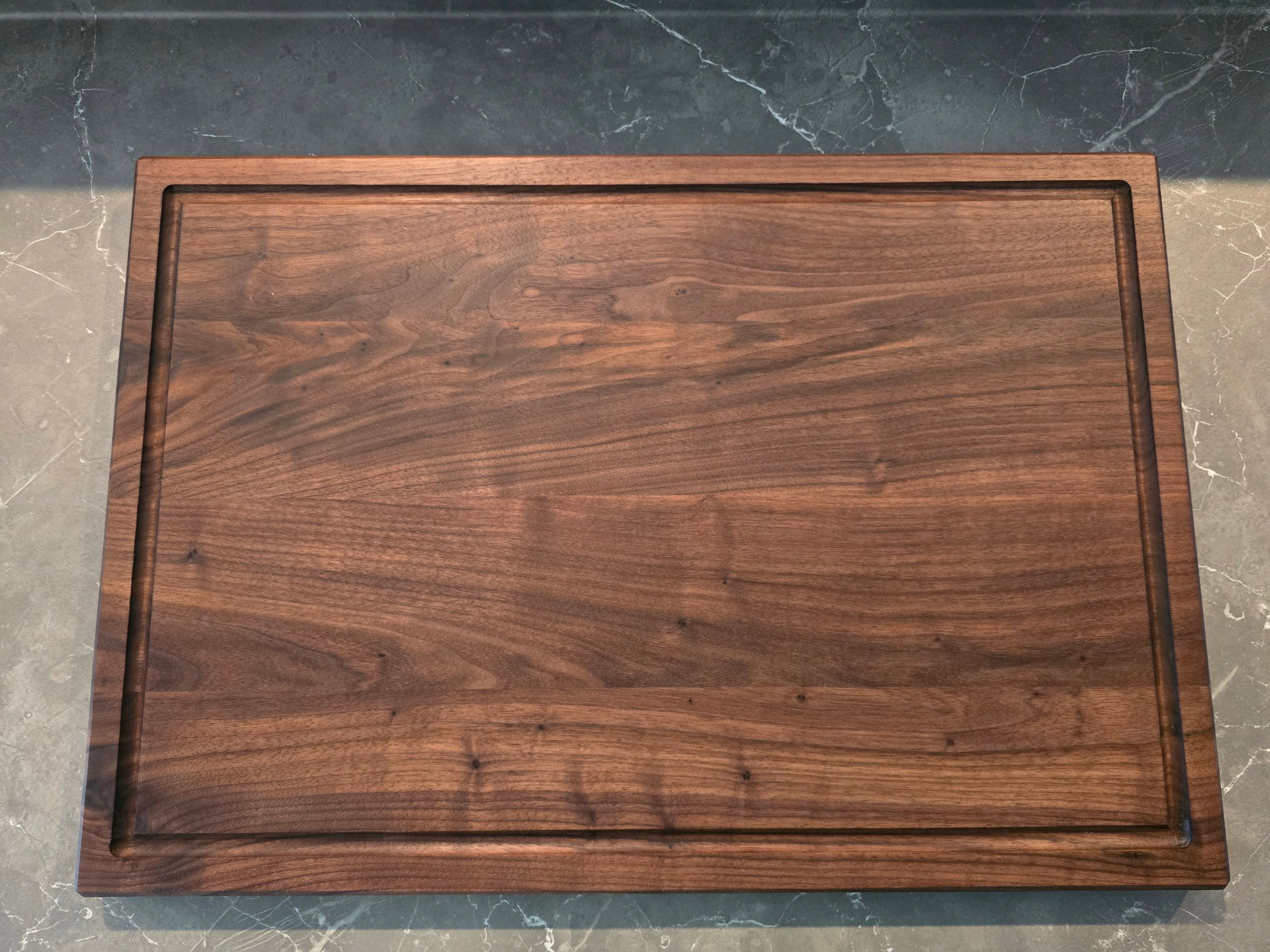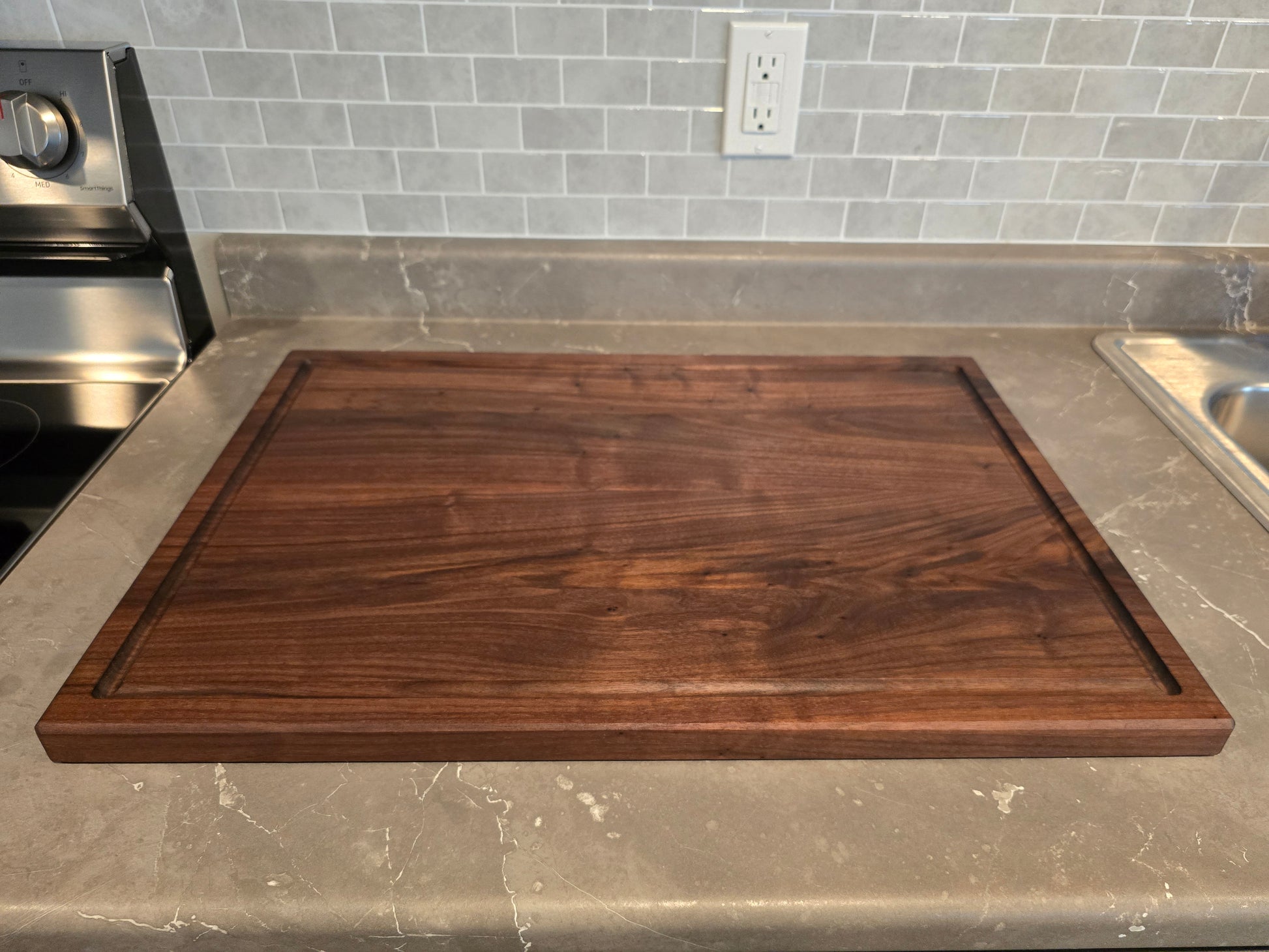 Extra large BBQ board made from locally sourced Wisconsin Black Walnut. Boards measure approximately 24 inches by 16.5 inches. Juice groove carved into boards to help catch everything from your BBQ!